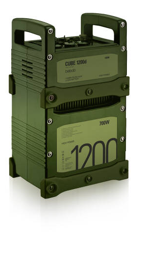 The CUBE1200 is a mobile 1.2 kWh battery built for military applications with high continuous power requirements. It provides 12 V, 24 V, and 48 V DC output, with a maximum continuous power of 700 W.